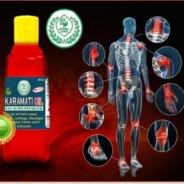 करामाती तेल हर प्रकार के दर्द में बेहद असरदार और लाभकारी है। चाहे जोड़ों का दर्द हो, कंधों का दर्द, गर्दन या कूल्हों का दर्द, गठिया हो या सायटिका (अरक-नसा), मांसपेशियों का दर्द हो या शरीर के किसी भी हिस्से में तकलीफ़ – यह तेल लगाते ही तुरंत आराम और राहत प्रदान करता है। सचमुच यह एक करामाती तेल है।