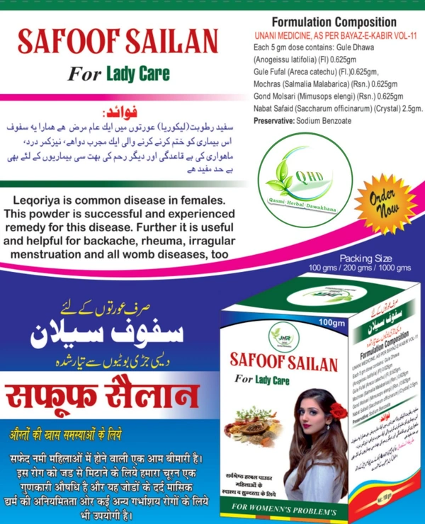 فوائد: سفید رطوبت(ليكوريا) عورتوں میں ایک عام مرض هے همارا یه سفوف اس بیماری کو ختم کرنے والی ایک مجرب دواهے، نیز کمر درد، ماہواری کی بے قاعدگی اور دیگر رحم کی بہت سی بیماریوں کے لئے بھی بے حد مفید ھے